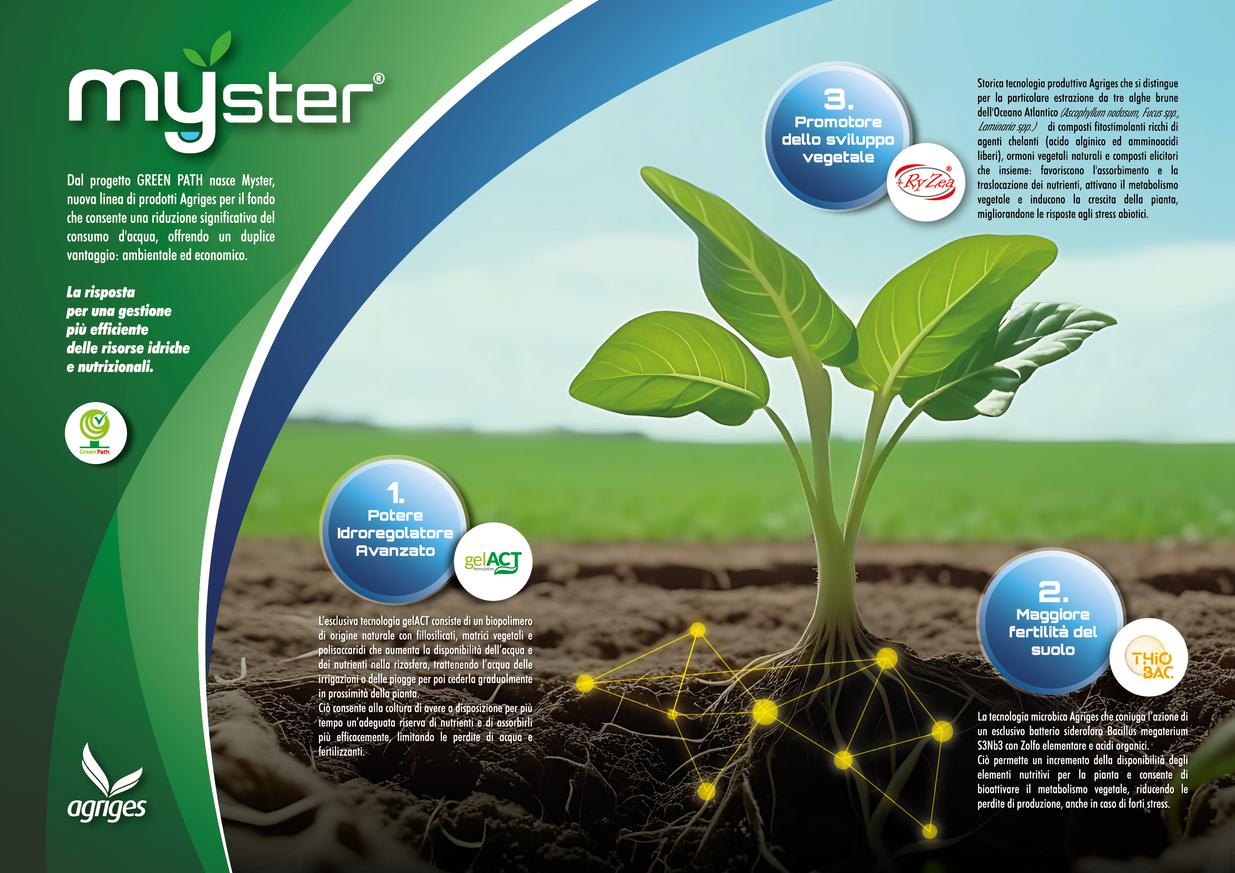 Nell’ambito del progetto Green Path nasce Myster, la risposta di Agriges alle sfide ambientali per una gestione agronomica più efficiente delle risorse idriche. Grazie alla presenza di tre esclusive tecnologie produttive, Myster, nuova linea di prodotti per il fondo, unisce il potere idroregolatore e idroprotettivo alle materie prime di elevata qualità per creare le condizioni ottimali alla produttività delle colture agrarie.