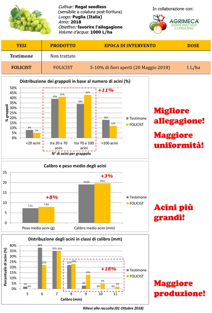 Si ottengono così grappoli di bell’aspetto, con chicchi di calibro uniforme e peso unitario superiore. FOLICIST® ha inoltre effetti positivi sulla raccolta: la maggiore uniformità di fioritura si traduce infatti in una maturazione concentrata dei grappoli, che agevola le operazioni di raccolta e ne riduce i costi. Soluzione sicura, ampiamente testata ed utilizzata FOLICIST® é registrato per l’impiego in Agricoltura Biologica.