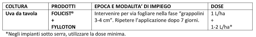 FOLICIST® e FYLLOTON si applicano per via fogliare nella fase di emissione dei grappolini, quando gli stessi hanno lunghezza di 3-4 cm circa: epoca caratterizzata da intensa attività metabolica e cellulare.