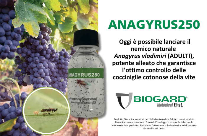 Novità da BIOGARD: Anagyrus 250 è una novità proposta sul mercato per il controllo delle cocciniglie. La tecnica prevede il lancio di adulti di Anagyrus vladimiri, un imenottero tipico del bacino del Mediterraneo, parassitoide di cocciniglie cotonose come la cocciniglia farinosa della vite (Planococcus ficus) e la cocciniglia farinosa (o cotonello) degli agrumi (P. citri).