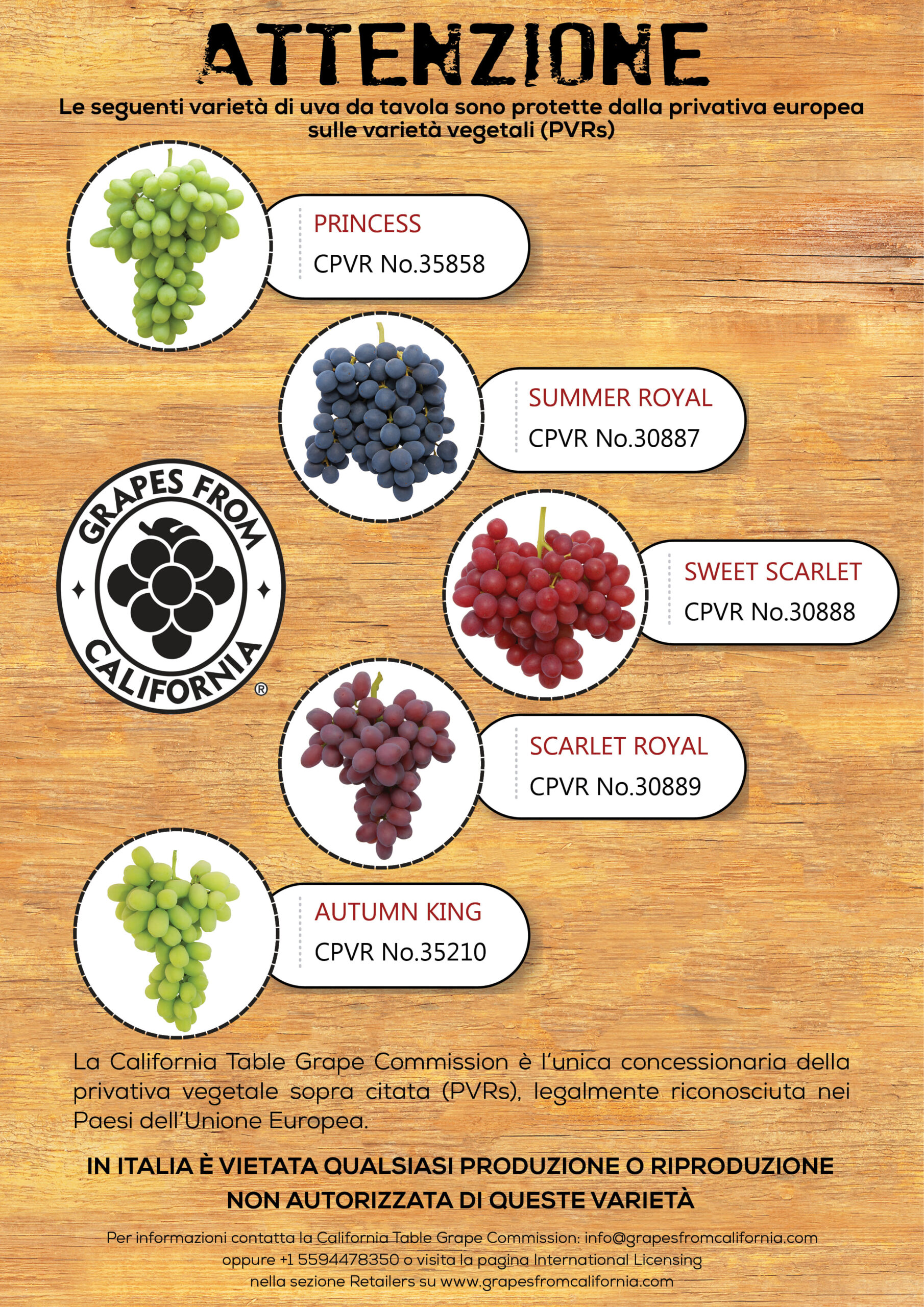 La California Table Grape Commission è l’unica concessionaria della privativa vegetale sopra citata (PVRs), legalmente riconosciuta nei Paesi dell’Unione Europea.