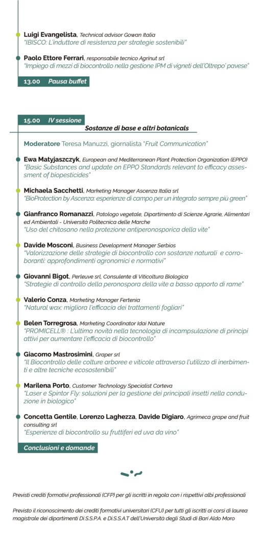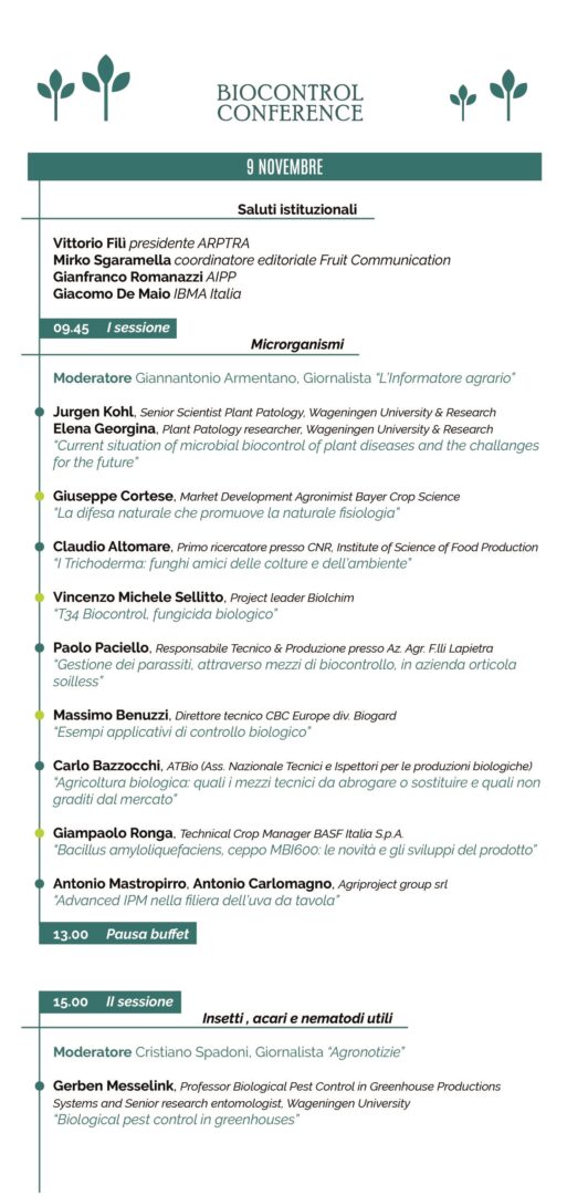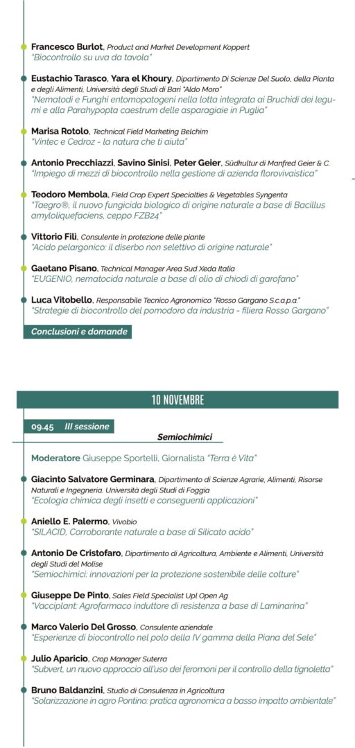 - Ecco di seguito tutto il parterre di ospiti provenienti dai più vivi e brillanti centri di ricerca che si occupano di difesa delle piante attraverso i mezzi di biocontrollo: