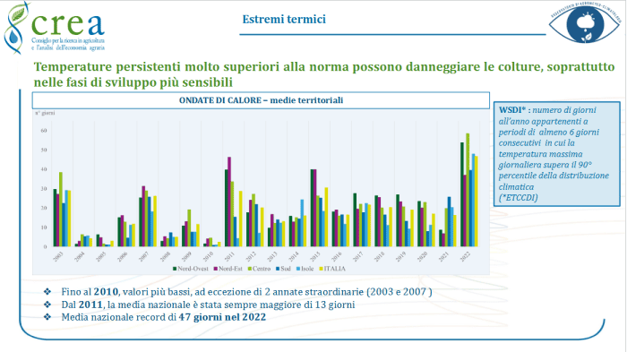Diversi sono stati gli indici meteorologici presi in esame. Primo fra tutti gli estremi termici che possono essere analizzati come ondate di calore. Secondo quanto riportato, dal 2011, le ondate di calore – un tempo eventi straordinari – sono diventate una costante. Il numero minimo di giorni con temperature estreme in Italia non è mai sceso sotto i 13 all’anno, fino a toccare il record di 47 giorni nel 2022. Basti pensare che temperature superiori ai 35°C, soglia critica per le colture, si sono registrate sempre più frequentemente, non limitandosi ai soli mesi estivi tradizionali, come agosto, ma comprendendo anche giugno e settembre che hanno registrato picchi significativi soprattutto nelle regioni settentrionali.