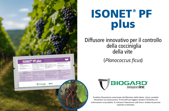 Per la stagione 2026 CBC BIOGARD®, divisione di CBC Europe srl, mette a disposizione dei viticoltori il diffusore Isonet PF Plus per la confusione sessuale di P. ficus. Si tratta di un diffusore innovativo, costituito da due microcapillari paralleli di materiale polimerico, uno dei quali contiene un filo di alluminio per permettere l’applicazione in campo, mentre l’altro è riempito della miscela feromonica specifica per questa cocciniglia. L’applicazione deve essere effettuata prima dell’inizio del primo volo, tipicamente ad inizio aprile.