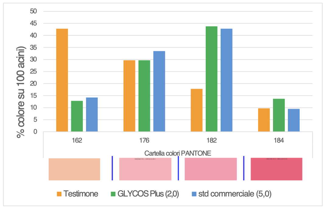 I rilievi effettuati alla raccolta hanno mostrato un netto miglioramento della colorazione, differenziandosi statisticamente dal testimone; in particolare, il rilievo effettuato sulla colorazione delle bacche ha evidenziato che il testimone presenta una difformità di colore con circa il 43% di grappoli con acini di colore rosa-chiaro tendenti al bianco (colore pantone 162), mentre nelle altre tesi tale percentuale si aggira intorno al 12-15%. Di contro, tutte le tesi trattate hanno una migliore e più uniforme colorazione rispetto al testimone. La tesi trattata con il prodotto di riferimento presenta una minore intensità della colorazione (pantone 184) e quindi risulta essere meno colorata alla vista (grafico 1).