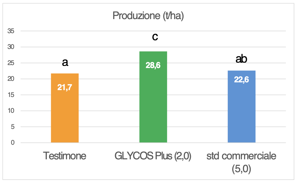 Per quanto riguarda la produzione (t/ha) le piante trattate con Glycos Plus hanno prodotto di più rispetto alle piante trattate con lo standard commerciale, ottenendo 28,6 t/ha contro le 22,6 t/ha, pari ad un incremento del 26% (grafico 3). Se confrontiamo la produzione delle piante trattate con Glycos Plus con le piante non trattate, l’incremento produttivo è stato del 32% (28,6 contro 21,7 t/ha).