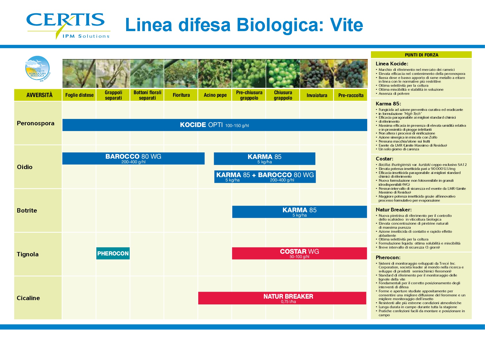 La linea di difesa Biologica della vite Certis si caratterizza per la presenza di specialità affermate quali Kocide® Opti, Karma® 85, Costar® WG e le trappole di monitoraggio Pherocon® che costituiscono validi ed efficaci strumenti di difesa per la Viticoltura moderna e non solo Biologica.