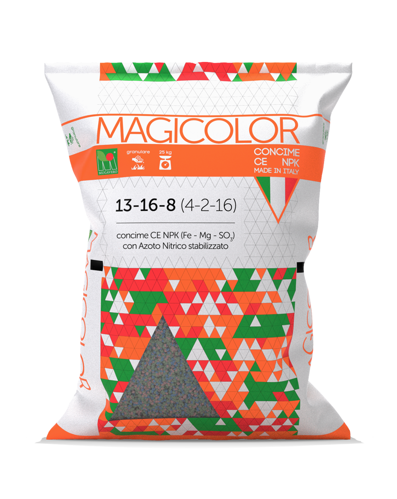 I prodotti della linea MAGICOLOR ® sono NPK granulari con alti contenuti di: FERRO (Fe), per ridurre le clorosi, MAGNESIO (Mg), importante per fotosintesi ed alleviare il disseccamento del rachide, ZOLFO (S), per abbassare il pH del terreno così da rendere nuovamente disponibili gli elementi insolubilizzati.