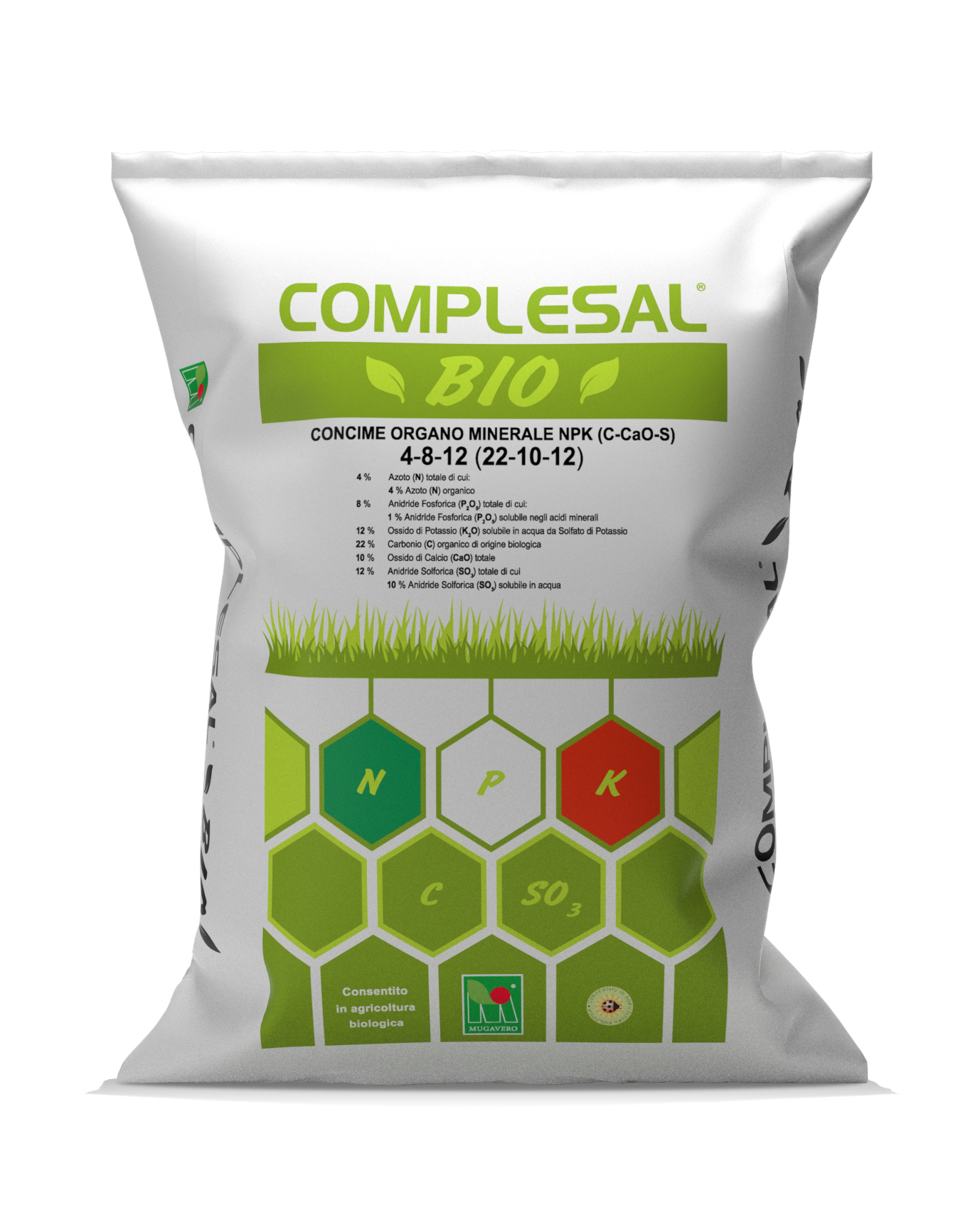 È un concime organo minerale contenente azoto, fosforo, potassio, calcio e zolfo, consentito in agricoltura biologica. L’azoto (4%) proveniente esclusivamente da farina di carne, così da essere lentamente trasformato in azoto nitrico assimilabile dalle piante. Il fosforo (8%) proveniente da farina d’ossa, ha una formulazione tale da renderlo disponibile nel lungo periodo. Il potassio (12%) interamente da solfato è estratto da miniere. L’azione acidificante dello zolfo (SO3 8%) permette di veicolare elementi nutritivi altrimenti bloccati e non disponibili per le radici delle piante. Il carbonio organico (22%) presente nel COMPLESALBIO ® incrementa la fertilità del terreno migliorando la struttura e favorendo l’attività della microflora e microfauna.