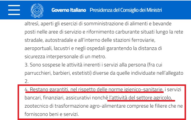 Lo stop alle attività non vale per il settore primario che, così come sottolineato da Conte ieri, e come riportato oggi dal sito ufficiale del governo: “Restano garantiti, nel rispetto delle norme igienico-sanitarie, i servizi bancari, finanziari, assicurativi nonché l’attività del settore agricolo, zootecnico di trasformazione agro-alimentare comprese le filiere che ne forniscono beni e servizi“.