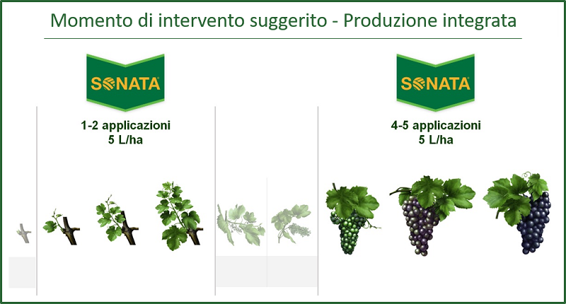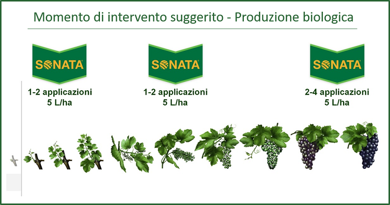 Sonata non ha tempi di carenza e può essere utilizzato su vite da vino e da tavola fino ad un massimo di 6 trattamenti l’anno, alla dose di 5 L/ha.