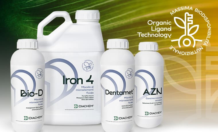 Per rispondere a questa esigenza, in Diachem abbiamo sviluppato l’Organic Ligand Technology (OLT), una tecnologia formulativa innovativa che garantisce massima assimilabilità, efficacia nutrizionale e biocompatibilità: i microelementi essenziali sono infatti veicolati dagli acidi organici che fungono da chiave d’ingresso nel “sistema pianta” e favoriscono un’elevata efficacia nella prevenzione e correzione delle carenze nutrizionali.