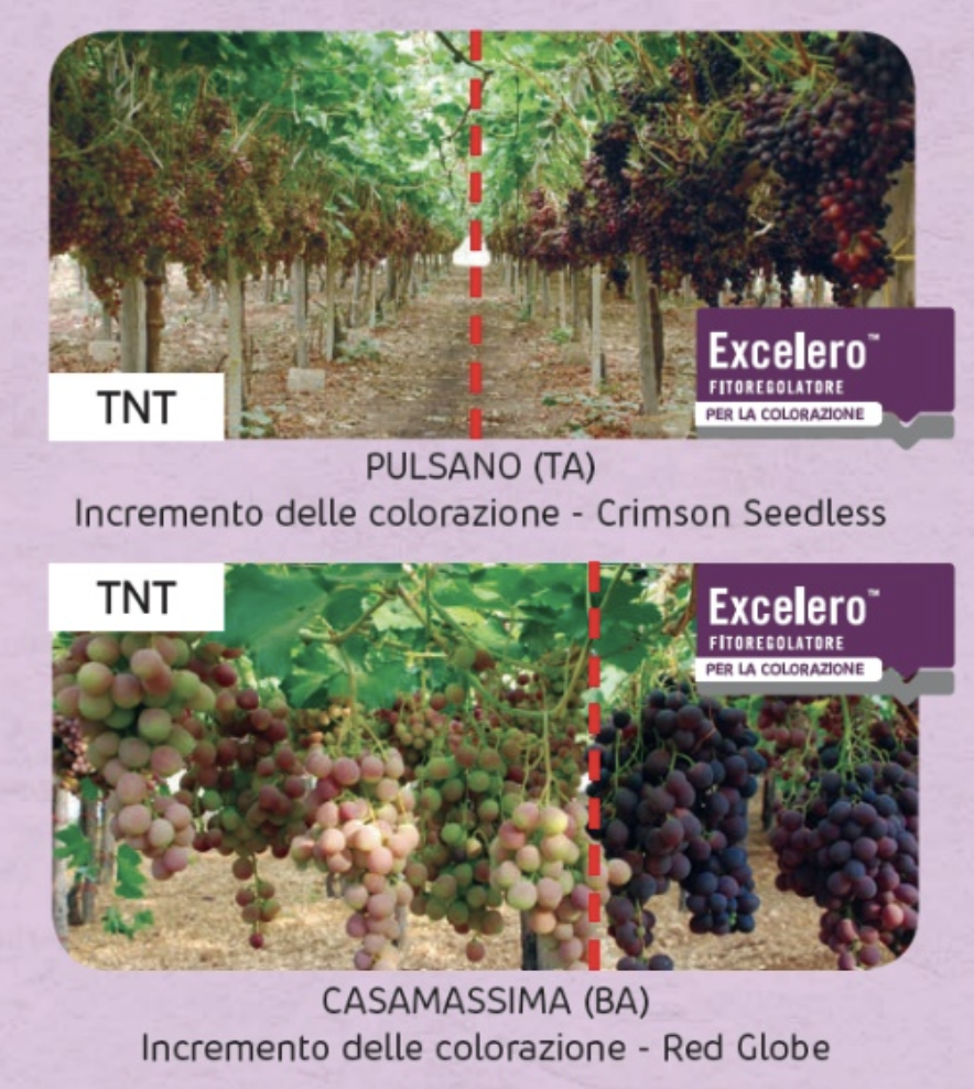 Oltre che a migliorare l’aspetto relativo alla colorazione, l’impiego di Excelero® permette ora anche di regolare l’uniformità nella formazione degli acini, riducendo il fenomeno dell’acinellatura e aumentando così il valore commerciale della produzione, con il contemporaneo risparmio nelle operazioni di manodopera.