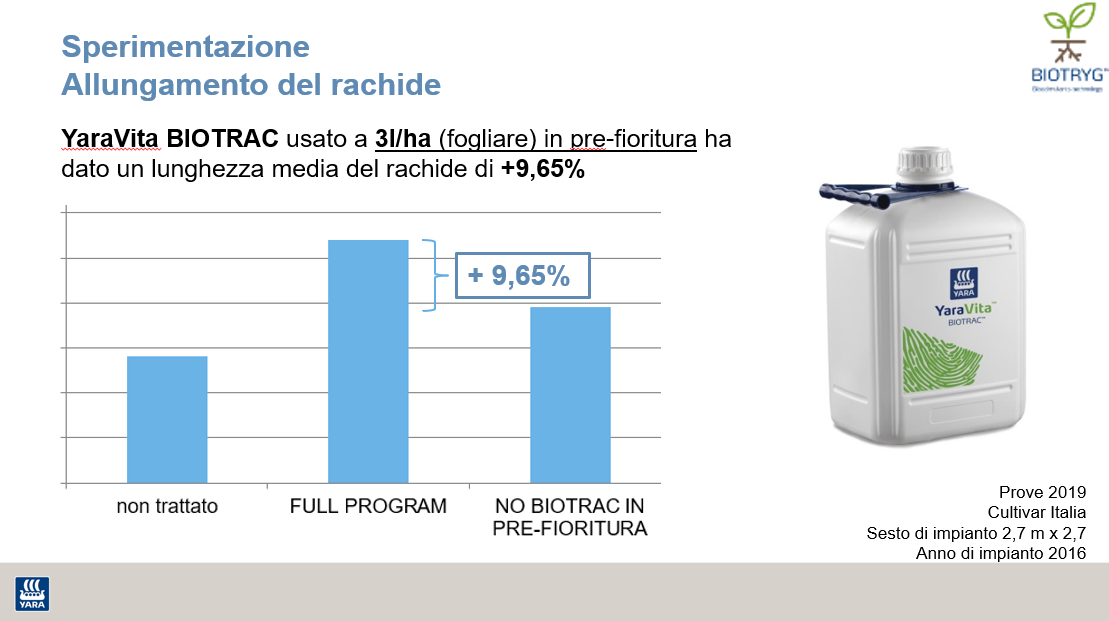 La soluzione Yara prevede l’utilizzo in pre-fioritura di YaraVita BIOTRAC, ottenuto dall’esperienza Yara nella formulazione di prodotti fogliari sicuri ed efficaci unita alle proprietà degli ingredienti bioattivi estratti da Ascophyllum Nodosum.