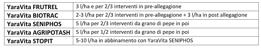 Il programma Yara si compone di YaraVita SENIPHOS, formulato di Fosforo e Calcio per dare energia e struttura durante la formazione del grappolo, e YaraVita STOPIT, prodotto storico e di qualità riconosciuta, per esaltare ancor di più le caratteristiche qualitative delle bacche.