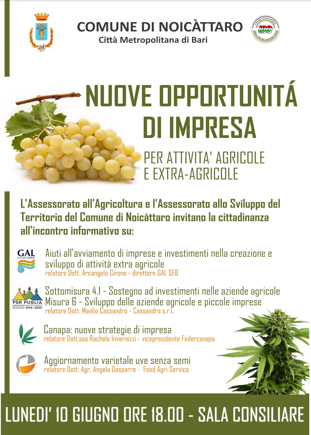L’Assessorato all’Agricoltura e l’Assessorato allo Sviluppo dell Territorio del Comune di Noicattaro (Ba) invitano la cittadinanza all’incontro informativo: “Nuove opportunità di impresa, per attività agricole e extra agricole“.