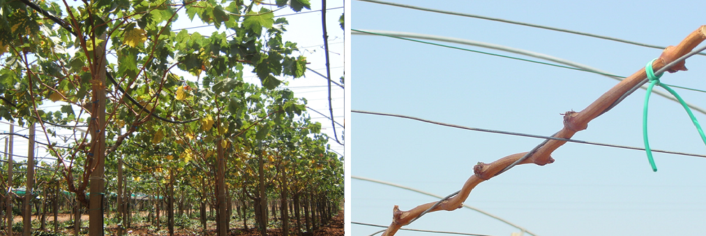 Su Vite da tavola ingiallimento della vegetazione ed inizio defogliazione dopo il trattamento con GRAN RISERVA (SX) e risultato finale della lignificazione del capo a frutto (DX).