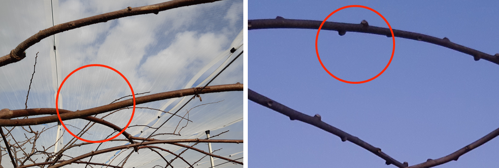Su actinidia capo a frutto non trattato (SX) e capo a frutto trattato con GRAN RISERVA (DX). Si apprezza l’evidente rigonfiamento delle gemme nella pianta trattata.