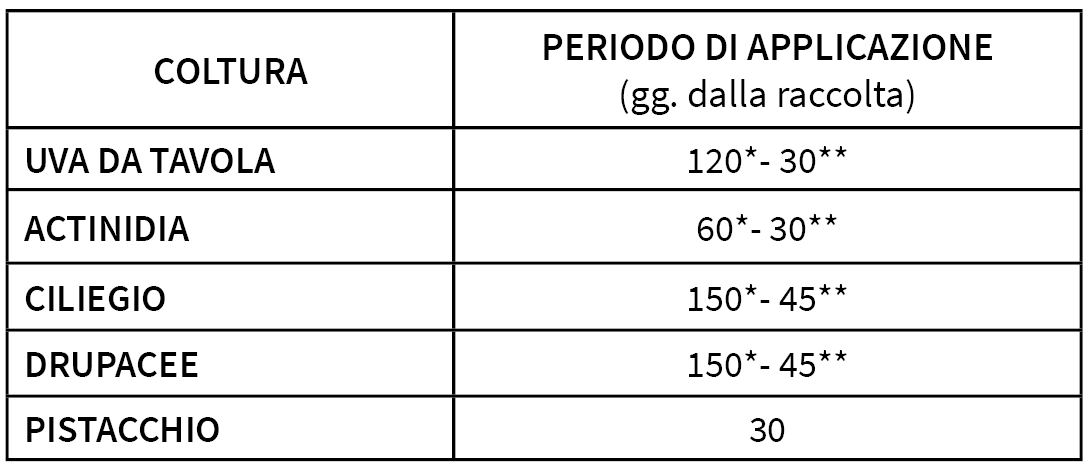 Il legno della pianta trattato con GRAN RISERVA acquisisce inoltre una maggiore resistenza agli agenti biotici e abiotici: GRAN RISERVA migliora infatti la resistenza al freddo della pianta e la difesa da agenti patogeni (funghi e batteri) inibendone lo sviluppo. Il periodo di applicazione varia in funzione dell’epoca di raccolta delle diverse colture: sulle colture a ciclo breve (cv precoci) è maggiore l’intervallo che intercorre tra la raccolta e l’inizio della filloptosi, su quelle a ciclo lungo (cv tardive) questo intervallo si riduce sensibilmente (Tabella 1).