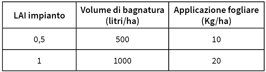 Impiegare il dosaggio più basso nel caso in cui la pianta abbia perso almeno il 50% delle foglie (LAI uguale a 0,5).