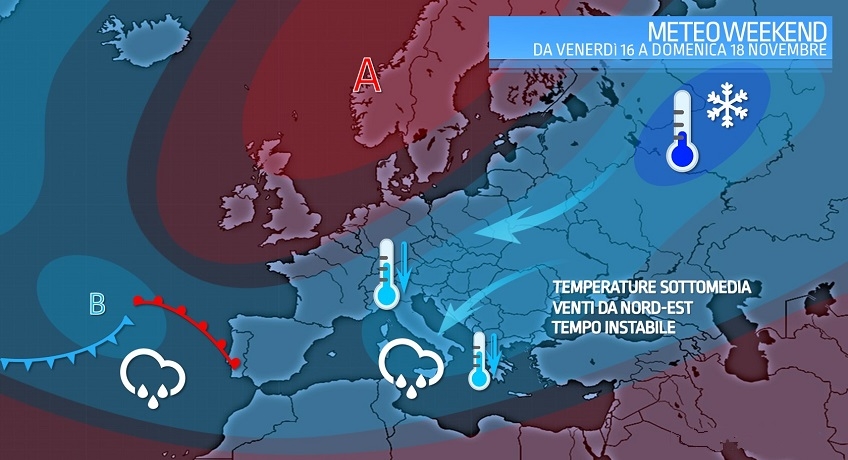 PRIMO FREDDO Per 2-3 giorni avremo quindi un clima semi-invernale: le temperature scenderanno anche di 6-8 gradi rispetto ai valori degli ultimi giorni finendo sotto la media stagionale. Le massime non supereranno i 13-14 gradi anche su pianure e coste mentre avremo minime a una cifra nell’entroterra e in collina mentre registreremo i primi valori sottozero in montagna. I venti saranno moderati dai quadranti nord-orientali (levante-grecale).