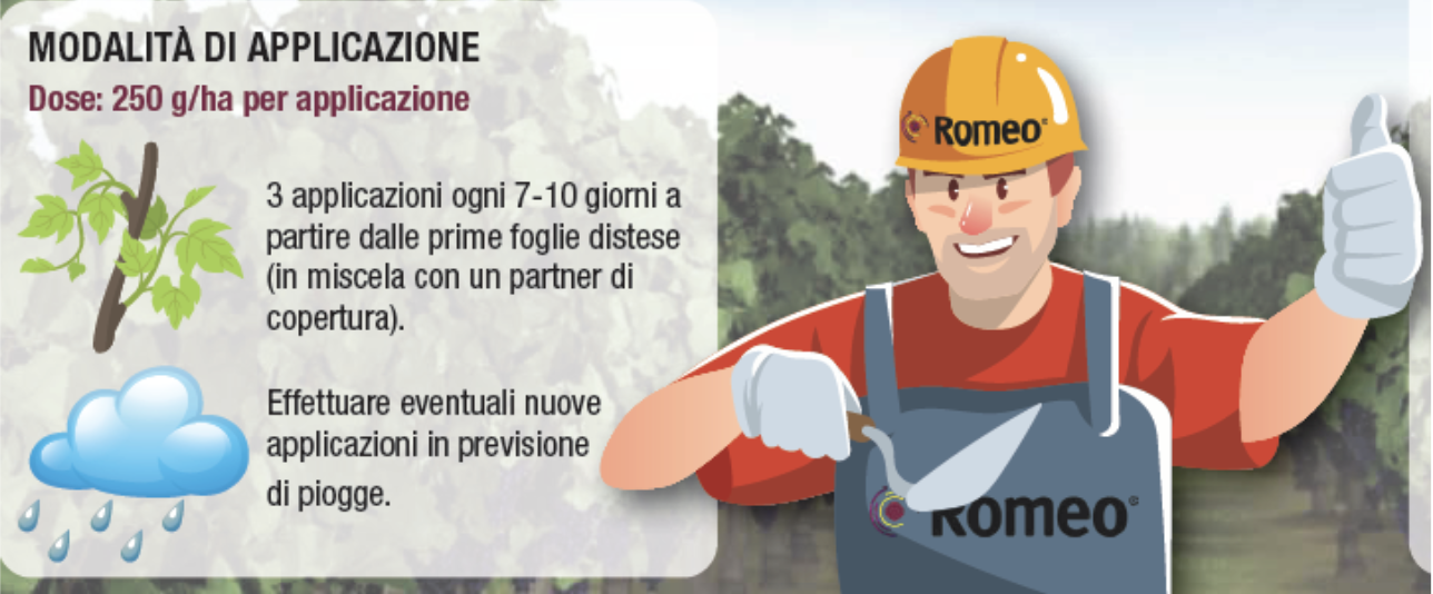 Come già detto, per avere le migliori performance di difesa possibili, si consiglia anche di aggiungere ROMEO® ai trattamenti fungicidi effettuati in previsione di piogge.
