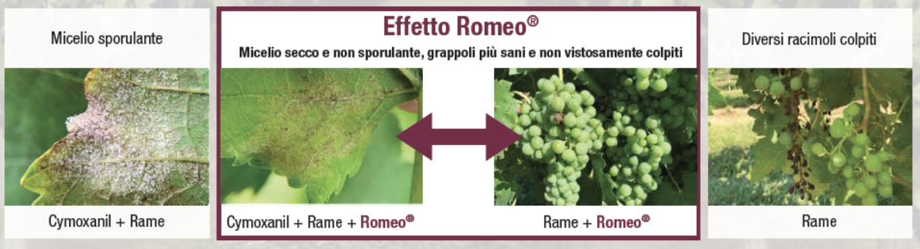 Le innumerevoli prove di campo degli ultimi anni hanno infatti comprovato che ROMEO® è in grado di innalzare significativamente l’efficacia dei prodotti antiperonosporici più utilizzati nell’agricoltura integrata garantendo la migliore salubrità possibile del vigneto.