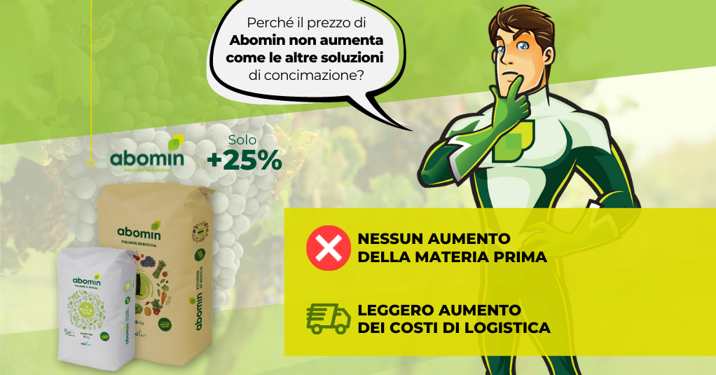 Oggi grazie a recenti scoperte con l’unione di sostanza organica e polvere di roccia Abomin si riesce a risparmiare notevolmente rispetto all’uso di concimi salini (solfati, nitrati, fosfati, uree) migliorando parametri qualitativi e quantitativi.
