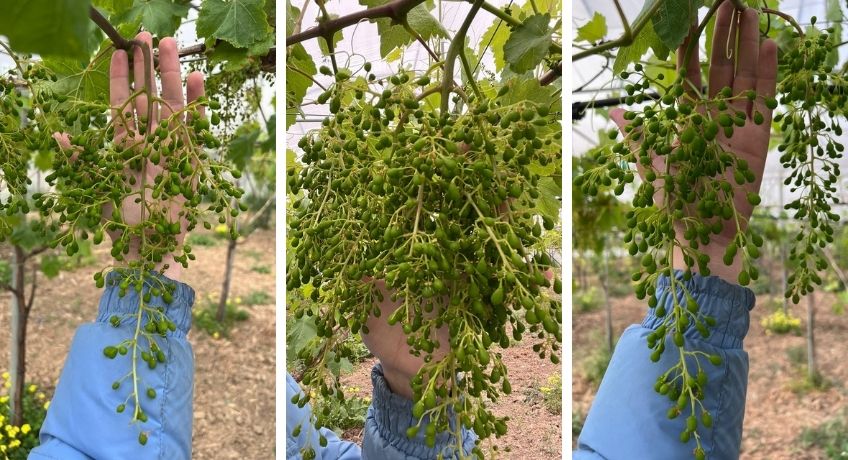 Nel mese di gennaio abbiamo continuato a seguire lo sviluppo delle sue viti, che mostravano già i primi grappolini. Oggi Antonio – fiero del suo considerevole anticipo – mi ha inviato delle foto che ritraggono la sua precocissima Black Magic con grappoli in piena fase di post allegagione: “Siamo i primi in Italia ad avere un anticipo così importante. Contiamo di cominciare a raccogliere il prodotto nel lasso di tempo che va dal 25 al 30 aprile“.