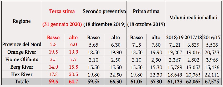 I dati mostrano una forchetta che va da 59,6 e 64,7 milioni di box raccolti (ogni box contiene circa 4,5 kg di uva). Si registra una flessione verso il basso delle stime a causa delle piogge cadute a metà gennaio nella regione del fiume Hex.