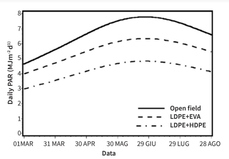 I tre film plastici si caratterizzarono per un diverso comportamento alla radiazione PAR, per cui in una tipica giornata primaverile, mentre all’esterno vi erano 1680 μmol m-2 s-1 di PAR, una temperatura dell’aria di 33 °C e un’umidità relativa del 28 %, il valore medio di radiazione PAR disponibile a livello fogliare oscillava tra 1240 μmol m-2 s-1 sotto la copertura bianca (-26 % vs. esterno) e 1060 μmol m-2 s-1 sotto il film plastico rosso (-37% vs. esterno); al contrario, la temperatura dell’aria interna era simile, l’UR era il 40 %, e le variazioni tra i film plastici ridotta. Nella cv Victoria, caratterizzata da una chioma non molto densa, la temperatura media fogliare raggiunse i 37 °C sotto la copertura di colore bianco alla fine di luglio mentre negli altri due film plastici la temperatura era più bassa (32 °C) in relazione alla maggiore trasparenza del film plastico bianco alla radiazione solare.