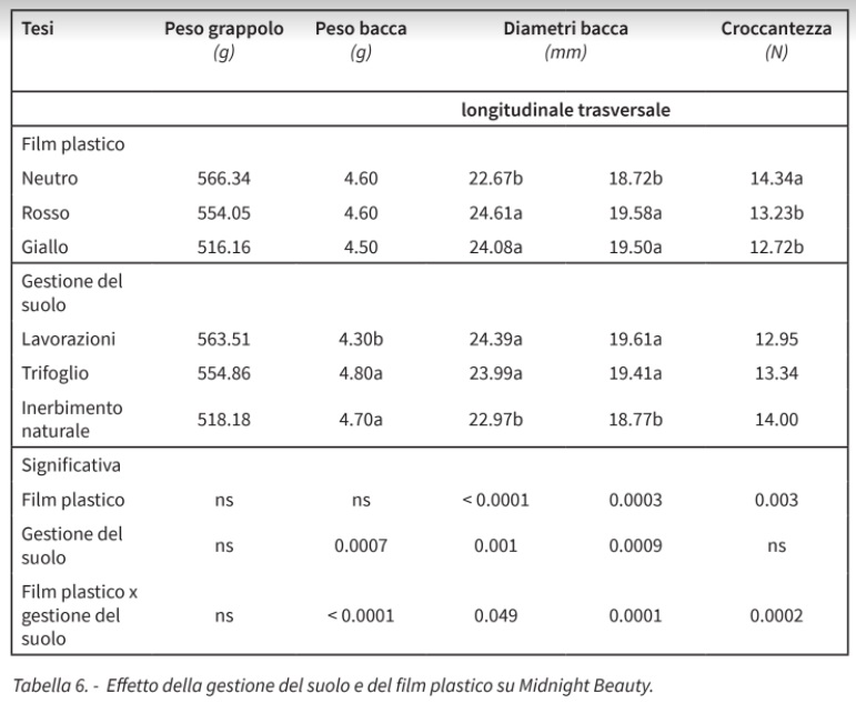 Sotto la copertura con film plastico bianco sia il numero di bacche per grappolo (70) che il peso grappolo (750 g) aumentarono del 20÷27 % rispetto alle altre due coperture; la maggiore differenza emerse rispetto al film plastico di colore giallo. Invece, il peso bacca subì un leggero incremento (+7 %) sotto la copertura con film rosso (10,6 g).