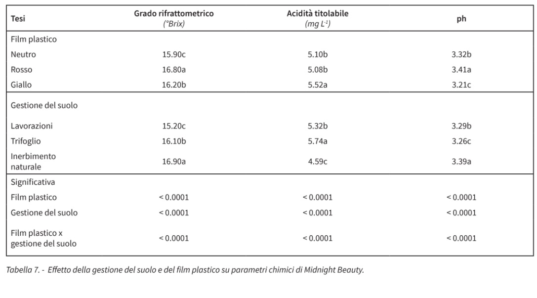 I diversi film plastici determinarono differenze significative sui parametri chimici del succo. Maggiore grado rifrattometrico fu riscontrato nelle uve prodotte sotto film plastico di colore rosso (16,80 °Brix), mentre il valore più basso nelle uve sotto copertura con film neutro. Riguardo alle tecniche di gestione del suolo, sia l’inerbimento con trifoglio sotterraneo che quello naturale produssero uve a maggiore contenuto zuccherino (Tab. 7).
