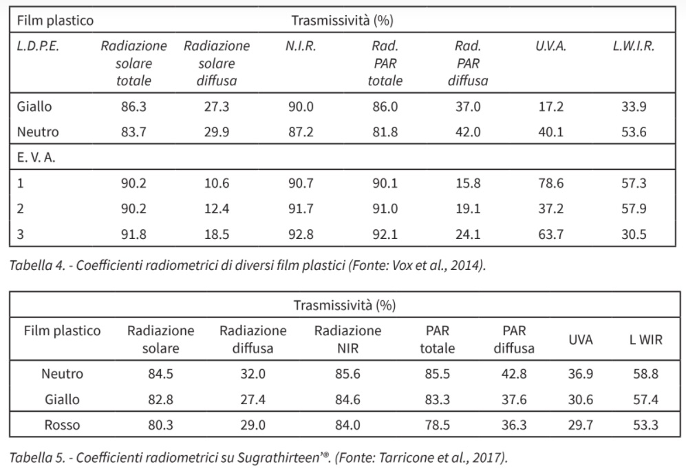 Da questa breve disamina emerge che non è possibile generalizzare sul comportamento dei diversi film plastici disponibili in commercio, i cui effetti sono anche legati alle specifiche composizioni e trasmissività, oltre che al comportamento fisiologico delle varietà su cui vengono impiegati (Tab. 4).