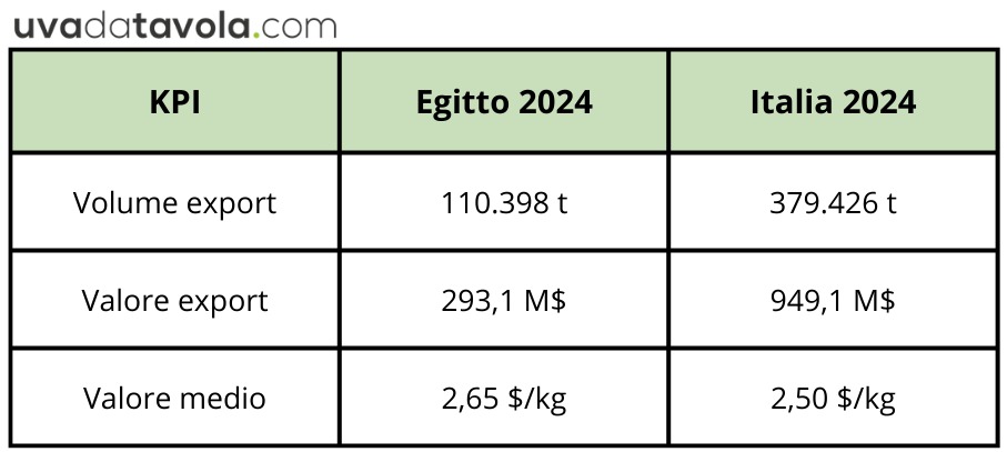 La tabella – elaborata su dati UN Comtrade (HS 080610 – fresh grapes; export; US$ e kg; 2014–2024) – mette a confronto Egitto e Italia nel 2024 sul commercio internazionale di uva da tavola, attraverso tre indicatori chiave (KPI): volume esportato, valore complessivo e valore medio per chilogrammo.