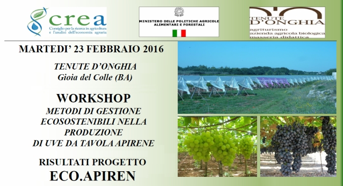 Si terrà martedì 23 febbraio alle ore 9.30, presso le Tenute D’Onghia di Gioia del Colle (BA), il workshop “Metodi di gestione ecosostenibili nella produzione di uve da tavola apirene”, con la presentazione dei risultati del progetto Eco.Apiren.